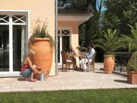 Dekoracyjny zbiornik na wodę VILAINE z integrowaną doniczką może być instalowany na zewnętrznej ścianie domu i w ten sposób oszczędzać miejsce - głębokość wynosi zaledwie 54 cm. Zbiornik jest wierną repliką glinianej wazy. Dzięki specjalnej technologii produkcji każda sztuka jest unikatem. Posiada gwint mosiężny 3/4" do łatwej instalacji mosiężnego kranu.